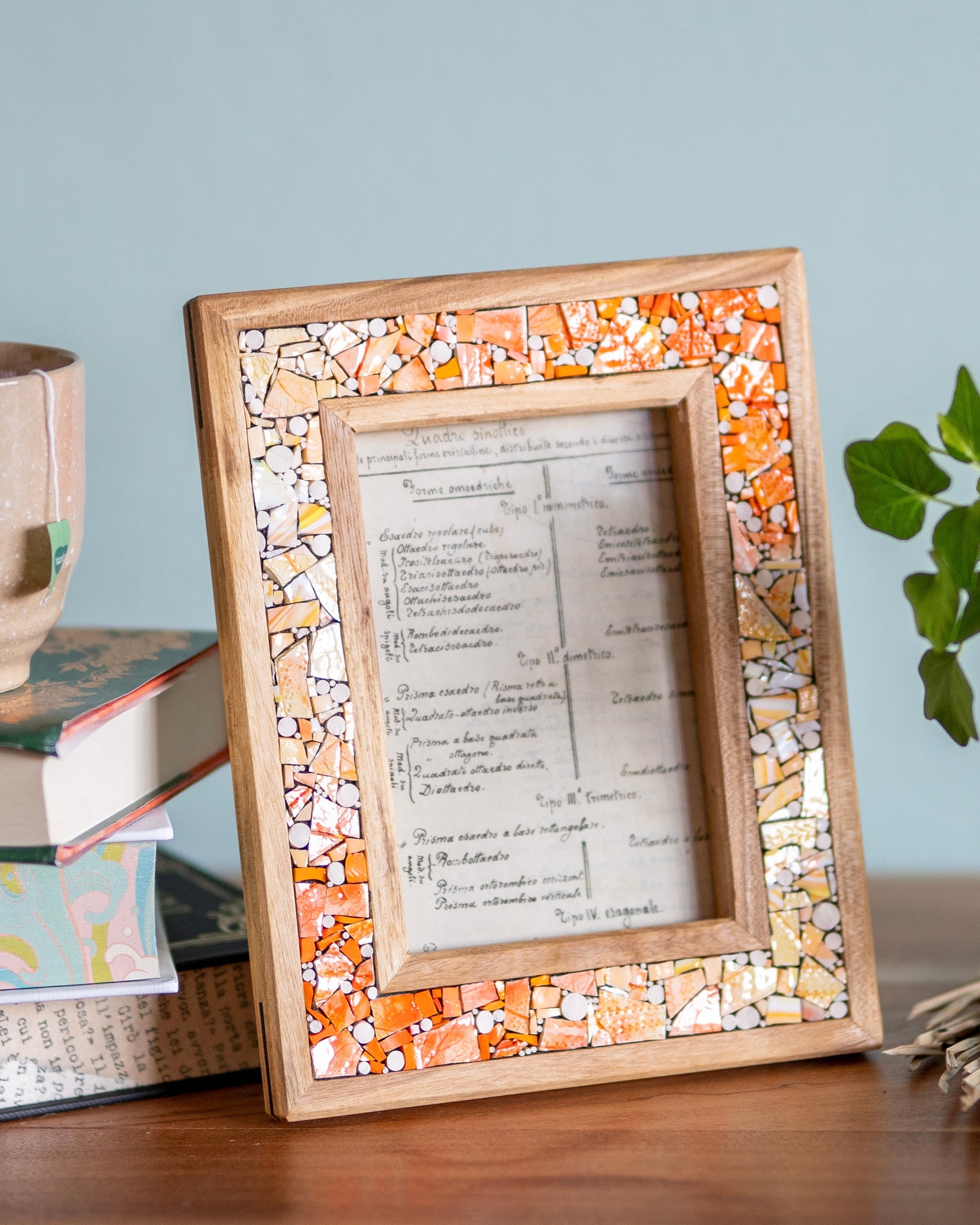 Preziosa cornice portafoto in legno di olmo e mosaico in ceramica e smalti veneziani nei toni dell'arancio. Può essere sia appesa che appoggiata (sia in orizzontale che in verticale) grazie ad un perno rimovibile. Dimensione foto 10x15