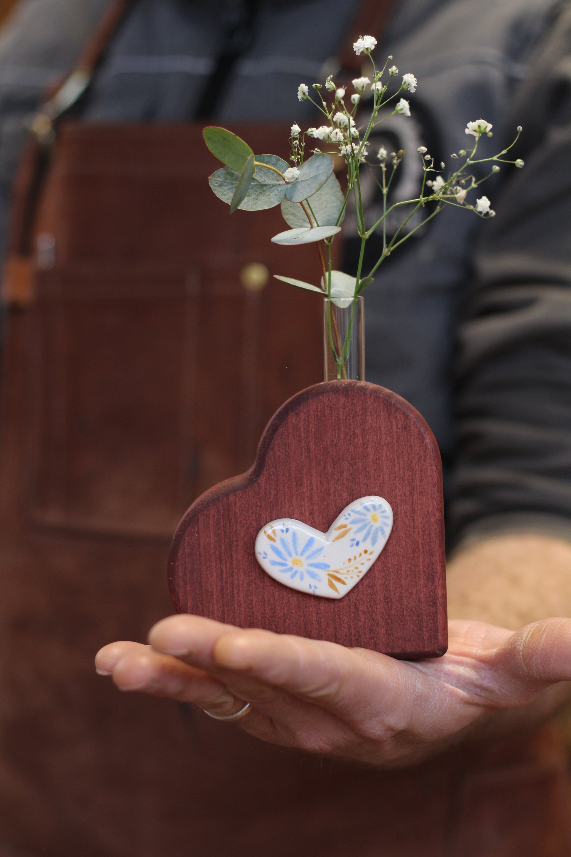 Piccolo cuore porta-fiala in quercia rosso decorato con una ceramica dipinta a mano, dimensioni 10x10cm. Fialetta in vetro inclusa.