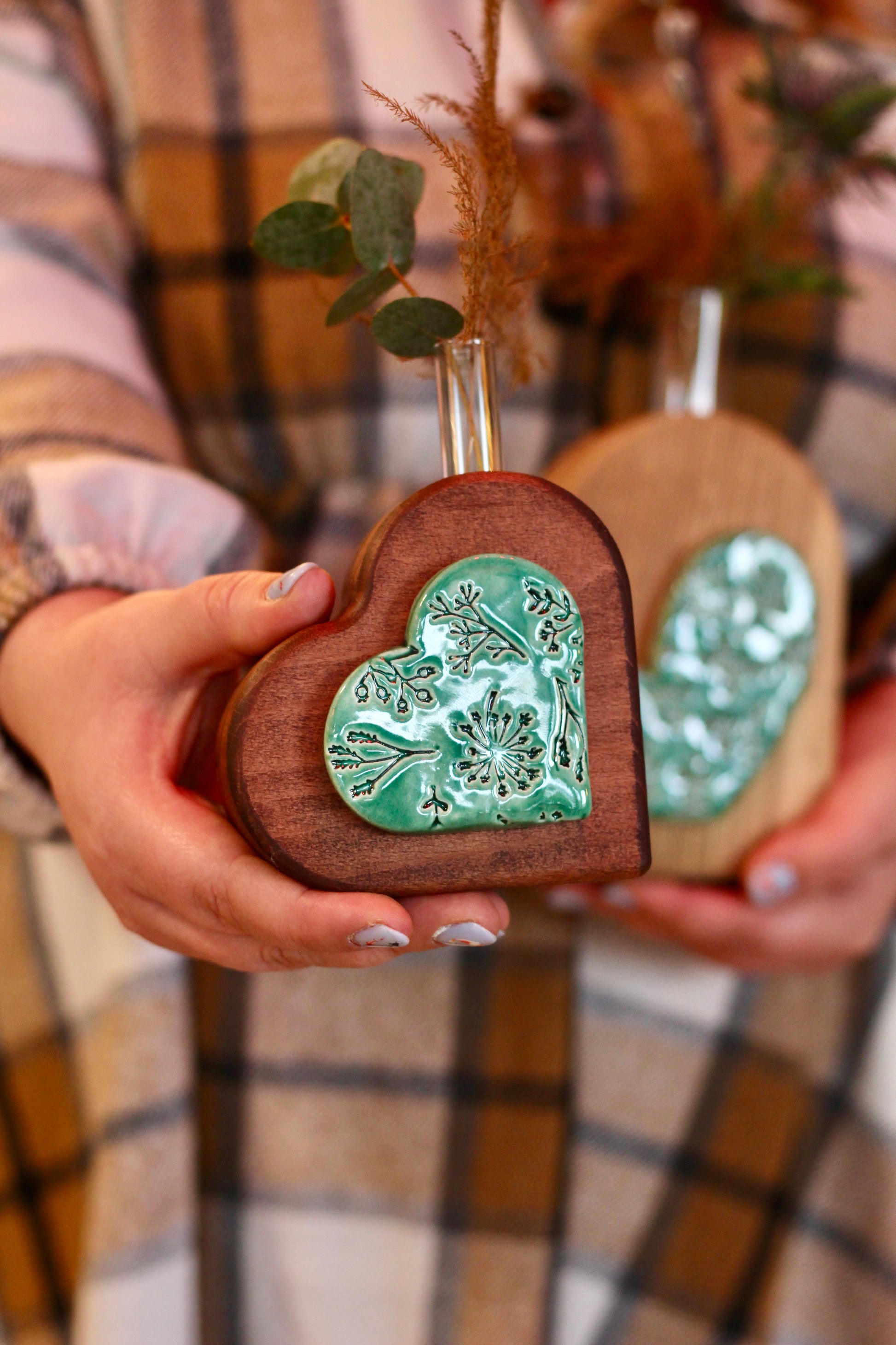 Piccolo cuore in legno decorato con una ceramica verde, dimensioni 10x10cm. Fialetta in vetro inclusa.