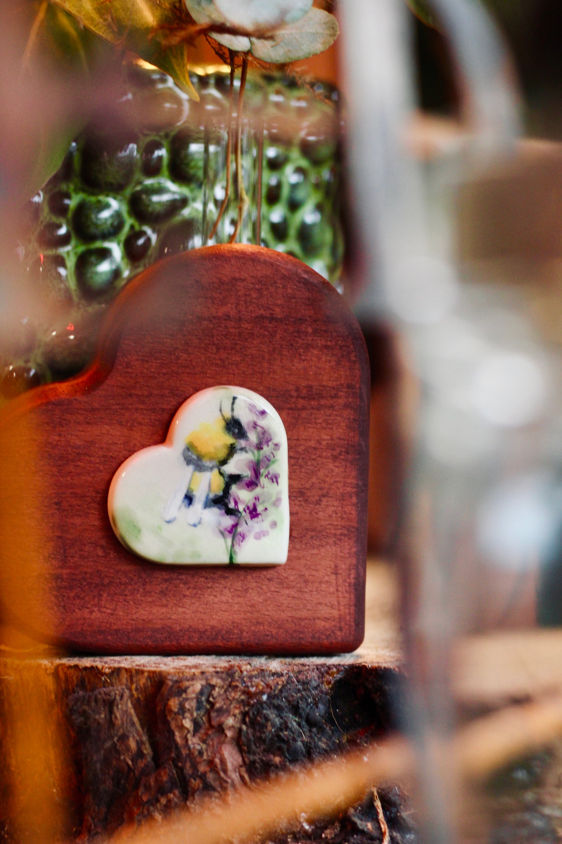 Piccolo cuore in legno decorato con una ceramica dipinta a mano, dimensioni 10x10cm. Fialetta in vetro inclusa.