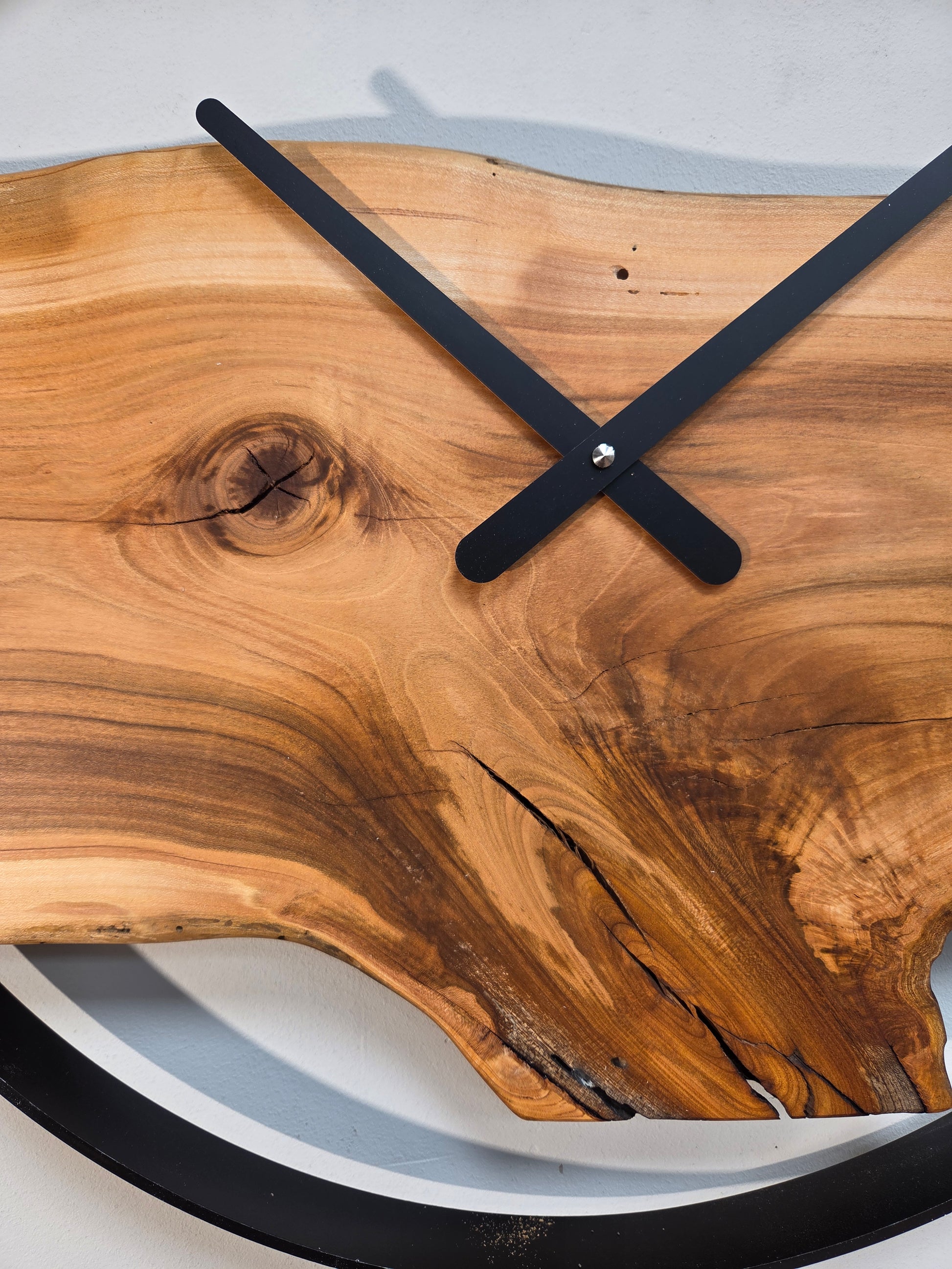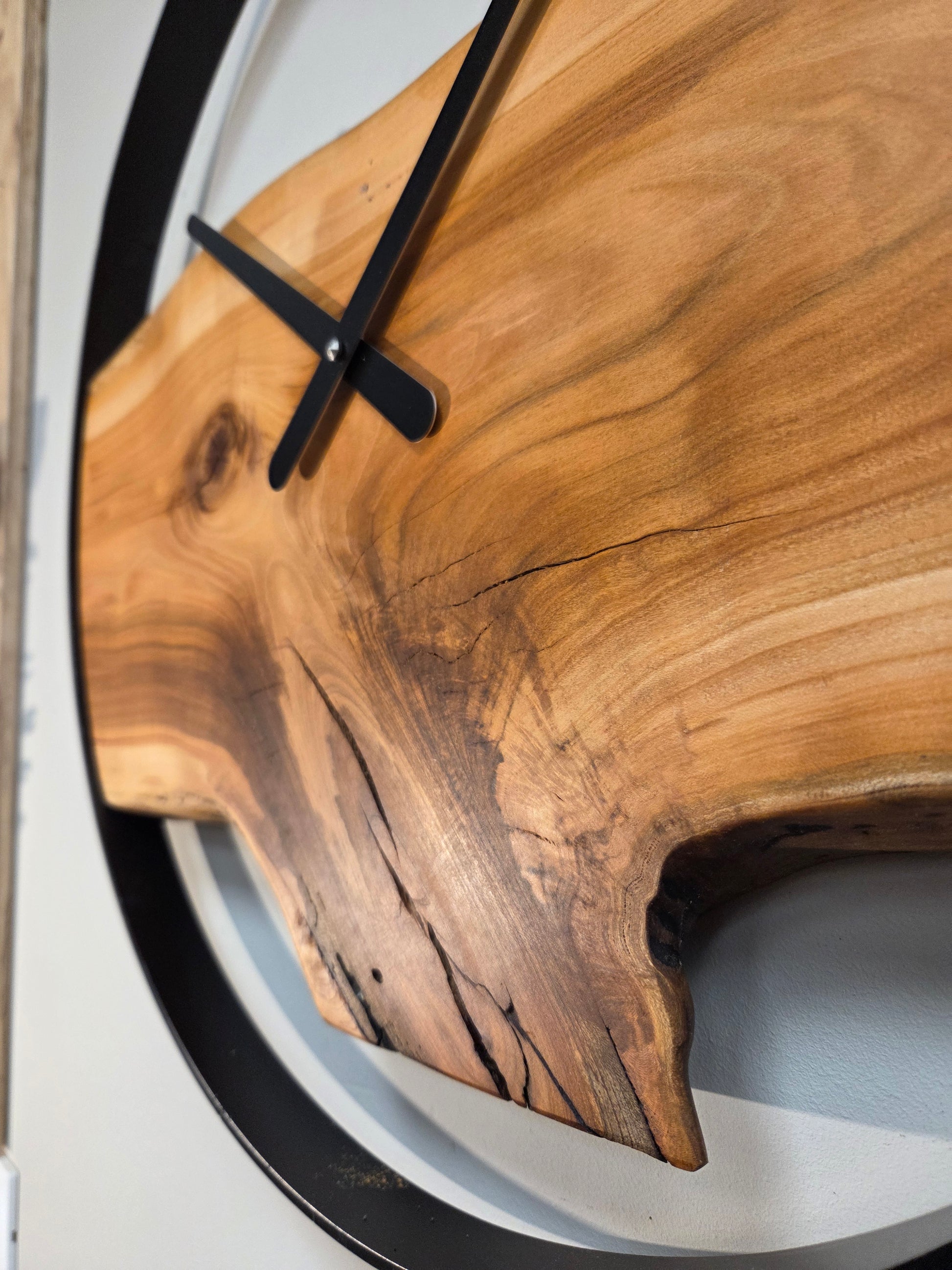 Grande orologio da parete in ciliegio, pezzo dalla forma unica, con quadrante calandrato in ferro verniciato nero lucido. Grandi lancette nere e meccanismo rinforzato fatto in Germania. Funziona con una normale batteria AA. Dato il peso, sul retro è presente un'attaccaglia in acciaio per il fissaggio a muro tramite tassello e vite. Diametro 50cm