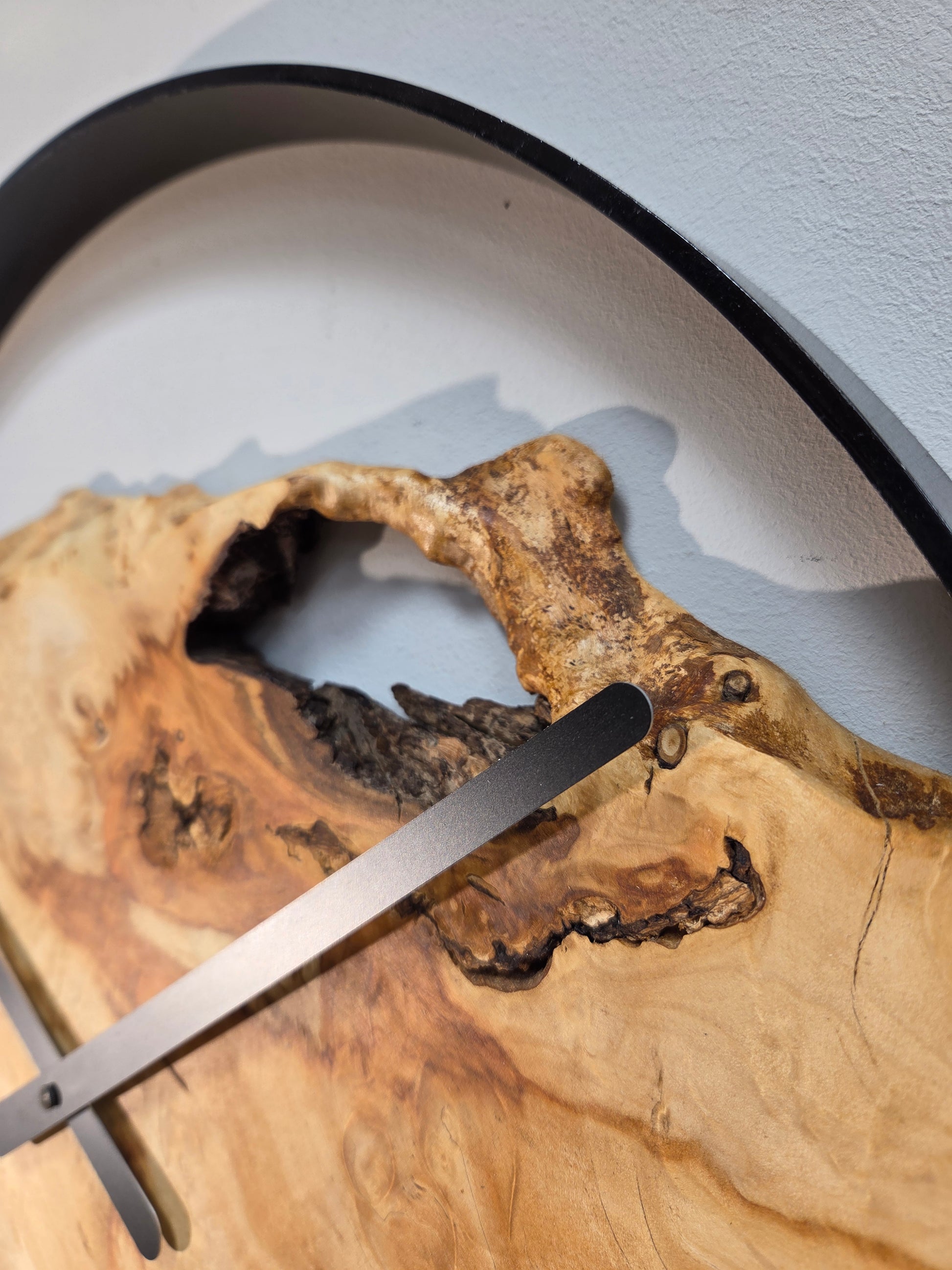 Grande e stupendo orologio da parete in acero, pezzo dalla forma unica e rara, con spaccature, marezzature, foro passante e piccoli nodi e dettagli sui quali la vista si perde, con quadrante calandrato in ferro verniciato nero lucido. Grandi lancette nere e meccanismo rinforzato fatto in Germania. Funziona con una normale batteria AA. Dato il peso, sul retro è presente un'attaccaglia in acciaio per il fissaggio a muro tramite tassello e vite. Diametro 50cm