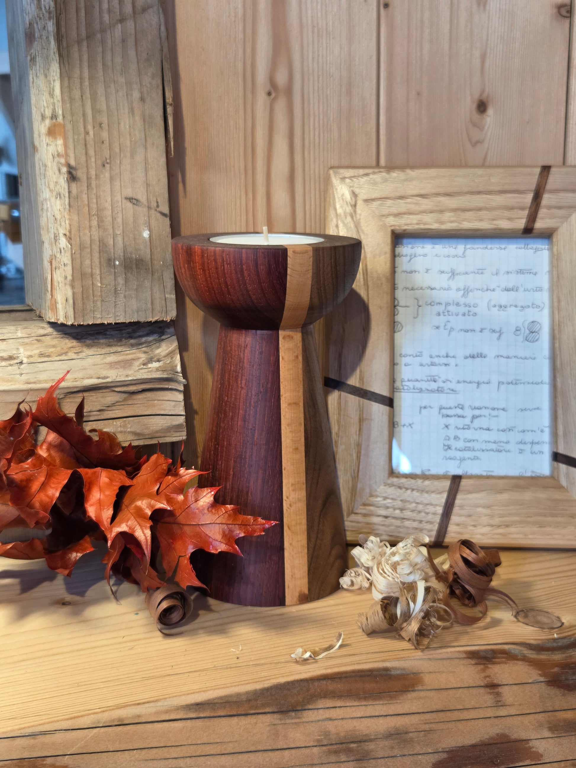 Portacandela in noce, faggio e padouk